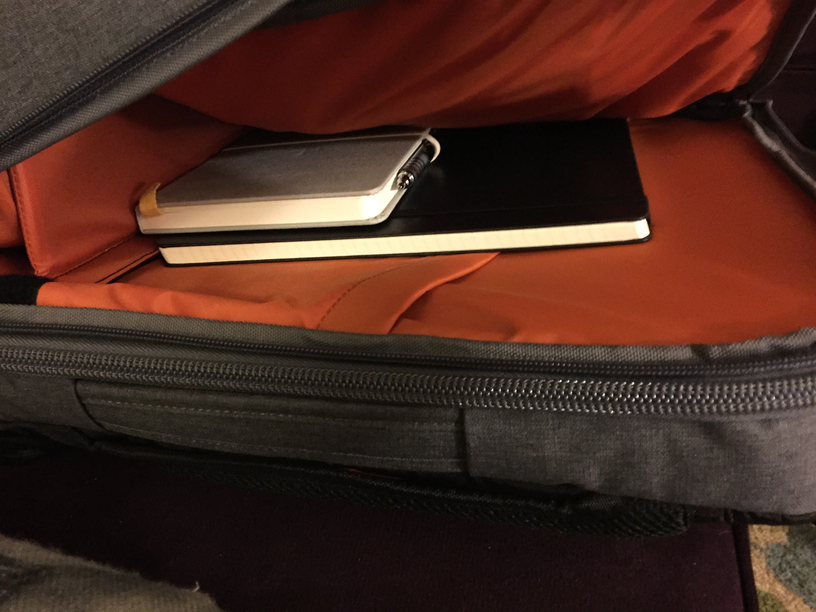 The bag also looks great. I got the heathered gray, which has an orange interior that contrasts nicely. It looks very mature, and is perfectly acceptable and appropriate for professionals who don’t want to lug around a briefcase or briefcase-style laptop bag.